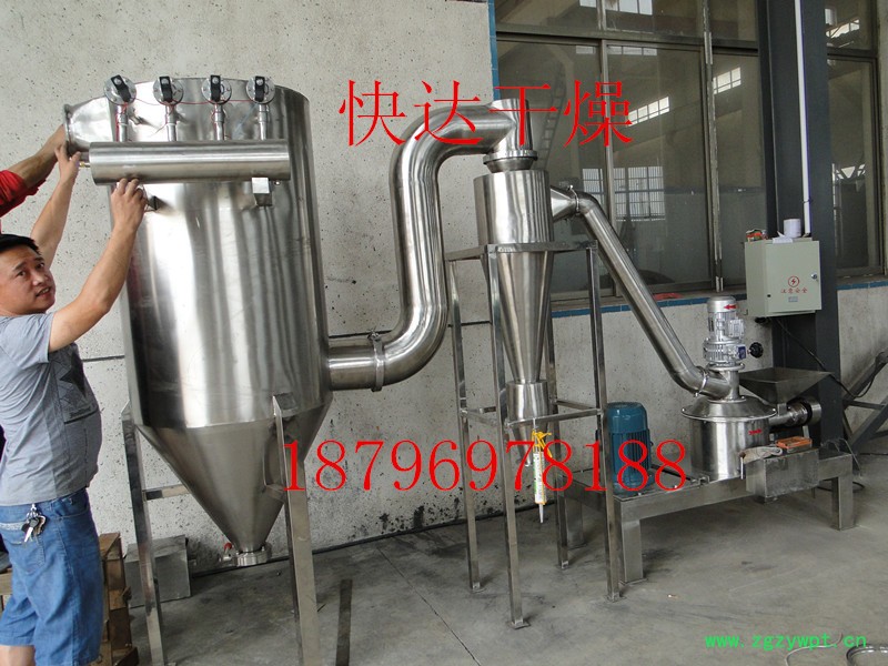 物料由料斗经螺旋输送器进入粉碎室,被高速旋转的刀片剪切粉碎,通过负压风运的方法把物料运入旋风分离器,袋式除尘器、排出物料达到产品的要求。