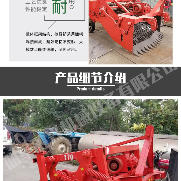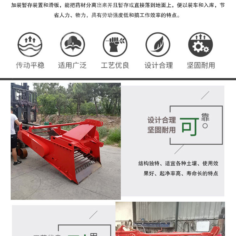 振动式药材 收 获机 主要适用于板蓝根、桔梗、黄芪、玉竹、白术、白芷、续断、黄芩、茯苓、防风、柴胡、远志、龙胆草、党参、丹参、苦参、雪参、血参、沙参、大黄、生地等药材的挖掘收获。机械收获过程中土垡回位较好,作业后不搅乱原耕层,并打破犁底层,疏松土壤,相当于对土地一次深松,形成适于作物生长发育的土体结构,增强土壤的透风、透气性能,土壤的渗透速度和水分容量,有效吸收天然降水,减少水土流失,达到性耕作的目的,本机具适用于各种土质,使用效果好,起净率高达 98 %以上,效率大大,是药材挖掘设备上的创新。