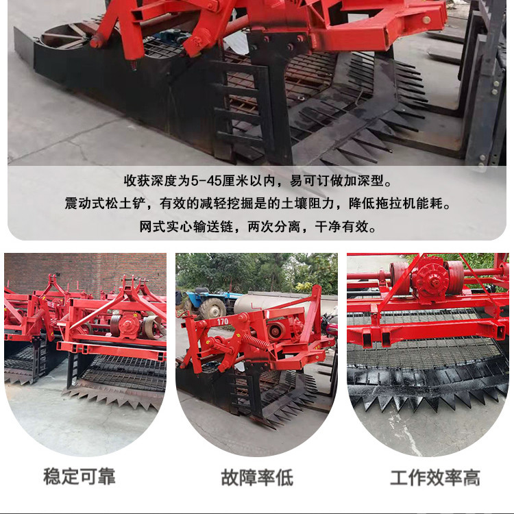振动式药材 收 获机 主要适用于板蓝根、桔梗、黄芪、玉竹、白术、白芷、续断、黄芩、茯苓、防风、柴胡、远志、龙胆草、党参、丹参、苦参、雪参、血参、沙参、大黄、生地等药材的挖掘收获。机械收获过程中土垡回位较好,作业后不搅乱原耕层,并打破犁底层,疏松土壤,相当于对土地一次深松,形成适于作物生长发育的土体结构,增强土壤的透风、透气性能,土壤的渗透速度和水分容量,有效吸收天然降水,减少水土流失,达到性耕作的目的,本机具适用于各种土质,使用效果好,起净率高达 98 %以上,效率大大,是药材挖掘设备上的创新。