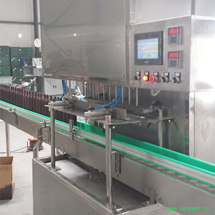 直线灌装机是一种由微电脑(PLC)可编程控制,光电传感,气动执行于一体的高新技术灌装设备。本机型分为压力式灌装、常压灌装、下潜式灌装、尤其下潜式灌装主要用于容易起泡沫的液体灌装。他设计有一套下潜灌装机构,下料管可下潜到瓶底部以消除泡沫的产生。灌装计量**,无气泡,无滴漏。适用灌装矿泉水、果汁、茶饮料、酱油、醋、调味品、中成药、生物制剂、农药、日用品等。可适用于300-10000ml各种瓶形(包括异型瓶)的灌装。