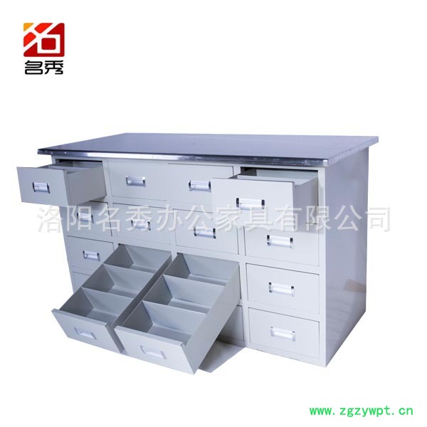 不锈钢、钢制中药柜柜体采用用**冷轧钢板精工制作,表面处理为聚能脂静电粉末喷涂(环保无毒害、无气味)。柜体可以颜色为经木红,浅灰色,每个小抽屉固定分成三格,可放一百多种中草药,有的下部抽屉可放较大药材,柜体内部全封闭,可防鼠、防潮、防串药,自制抽屉平导轨,推拉自如。以传统样式为基础,不断推出新的样式。在保存了传统风格的前提下,满足了现代多样性的需要,产品畅销全国各地区。洛阳名秀办公家具有限公司已拥有以不锈钢、钢板喷塑类为主的中药柜、中药台系列;西药柜、西药架系列;西药调剂台系列;护理病床系列;护理车系列;手术室系列;等二百多个品种,并可随时根据要求设计订做。