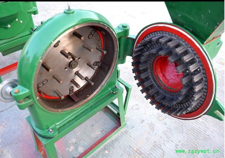 该齿爪式粉碎机在机座上装有主机,主机包括有机体以及和机体连接在一起的活门组成的粉碎室,机体内装有轴承以及由轴承支承的主轴,主轴伸出机体外部的一端装有皮带轮,在粉碎室内的一端装有转子,轴承两端装有内端盖和外端盖,转子上紧固有数圈钢齿,与固定在活门里的齿盘交错配置,活门上端有入料口,入料口上面装有盛料斗,活门下端有出料口。工作原理:利用固定齿盘与活动齿盘间的相对运动,物料经齿冲击,碰撞与摩擦获得粉碎,粉碎的物料经过筛网,由出料口排出机外,出料细度由更换不同目数的筛网获得。