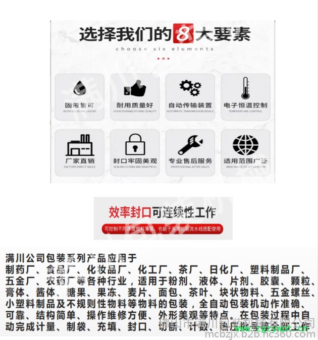满川包装机械有限公司包装系列产品应用于制药厂、食品厂、玩具厂、医药用品厂、茶厂、日化厂、塑料制品厂、五金厂等各种行业,适用于粉剂、液体、片剂、胶囊、颗粒、膏体、酱体、糖果、果冻、麦片、面包、茶叶、块状物料、五金螺丝、小塑料制品及不规则性物料等物料的包装,全自动包装机动作准确、可靠、结构简单、操作维修方便、外形美观等特点。在包装过程中自动完成计量、制袋、充填、封口、切断、计数、热压批号等全部工作。