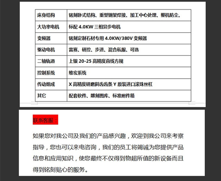 山东铭刻数控设备有限公司,是数控石材雕刻机的**企业,集研发、生产、销售、售后服务为一体的大型石材雕刻机厂家,自己拥有喷塑焊接车间,大型五面铣床,各种型号颜色可以自由订制。应市场需求,铭刻推出石材数控绳锯,石材异形切割机,线型绳锯切割,石材轮廓切割机等产品,很多需要手工操作费工费时的工艺,被我们的绳锯机所代替,受到广大客户的欢迎。订机热线:15165927563
