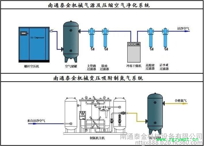制氮机是根据变压吸附原理,采用高品质的碳分子筛作为吸附剂,在一定的压力下,从空气中提取氮气。经过净化干燥的压缩空气,在吸附器中进行加压吸附、减压解吸。由于空气动力学效应,氧在碳分子筛微孔中扩散速率远大于氮,氧被碳分子筛优先吸附,氮在气相中被富集起来,形成成品氮气。然后经减压至常压,吸附剂脱附所吸附的氧气等杂质,实现再生。一般在系统中设置两个吸附塔,一塔吸附产氮,另一塔脱附再生,通过PLC程序控制器控制气动阀的启闭,使两塔交替循环,以实现连续生产高品质氮气之目的。