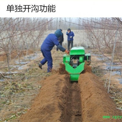 轮传动驱动开沟机工作。使用农家肥时,开沟机将土抛到沟的两侧,人工将肥料放到沟里后,可通过更换回