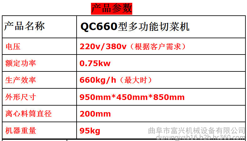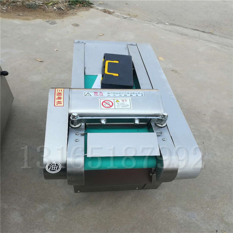 本机模拟手工切菜,切丝,切段等原理,采用电机皮带变速方式实现高低运转。可以高效能的完成2-25mm切丝需求,料头的离心式切片构造可以完成硬质瓜果蔬菜等的切片功能。传送带装置可以将料头的产物直接输送到刀架下。通过不同的刀片将片,叶,根,茎等蔬菜或其他制品加工成片,丝,丁,块,条等多种形状。更多功能请买家自己体验! 使用方法: 1.将机器放置在水平的工作场地上,确保机器下边四脚平稳,可靠,不晃动.仔细检查旋筒内有无杂物,如有异物清理干净,以免引起机器损坏.对各部件进行检滴油.紧固件是否使用中松动,开关线路是否破损. 2.为确保安全,必须在接地标记处可靠接地,电源接头必须安装漏电保护器!!! 3.机器工作时,严禁将手伸入机器内,在加工过程中勿用湿手按开关。 4.在进行清理拆卸前,首先断开电源,使机器停止运转。 5.轴承每3个月更换1次钙基润滑脂。 6.在使用过程中,若出现异常情况,应迅速关闭电源开关,待故障排除后重新启动,使之正常工作