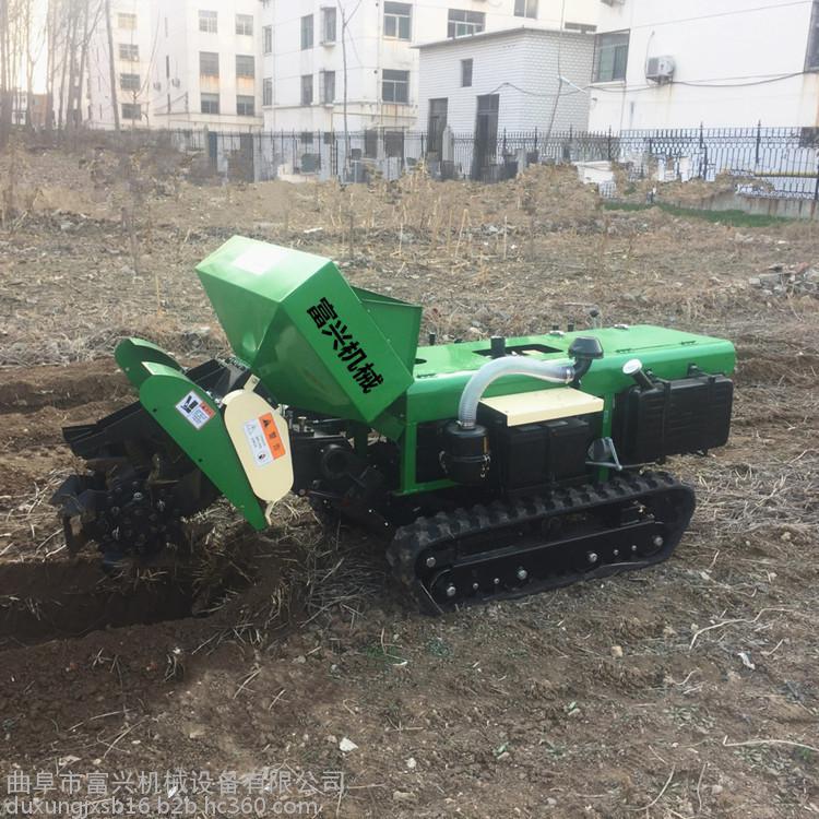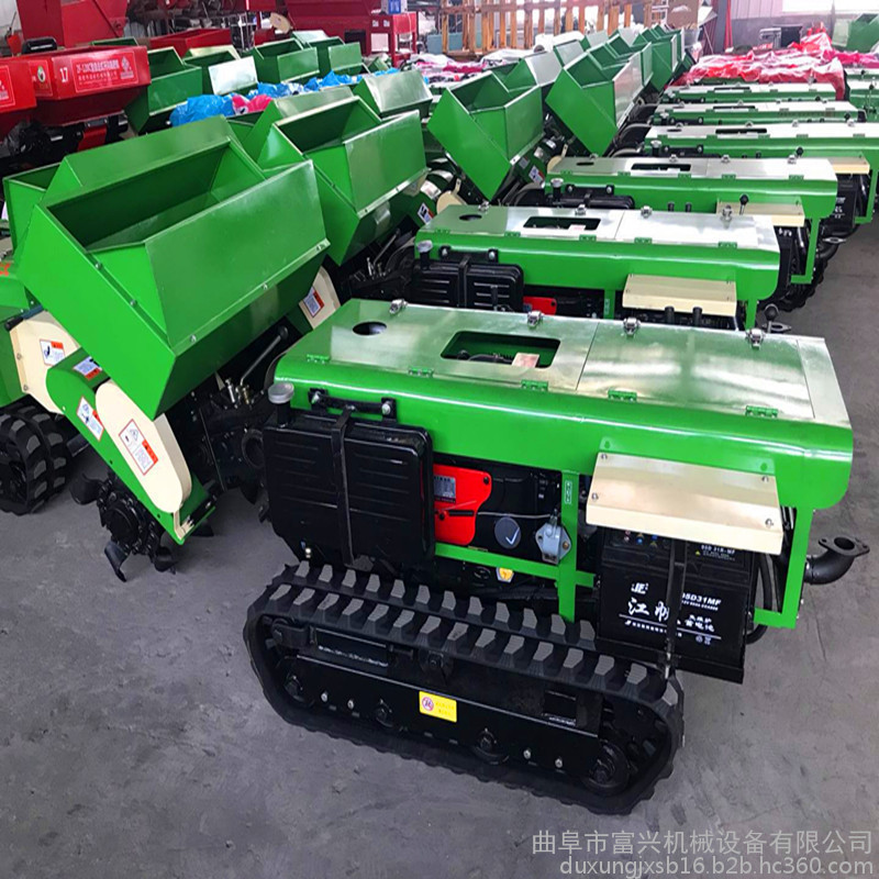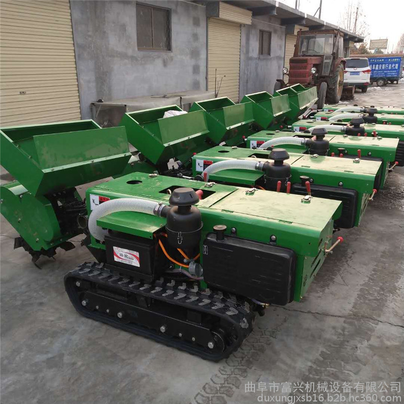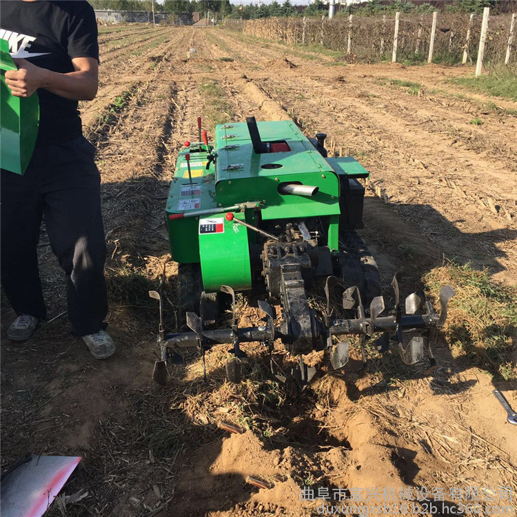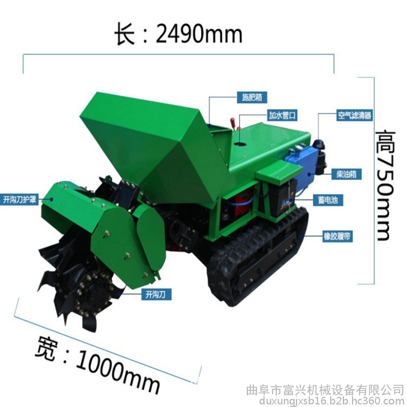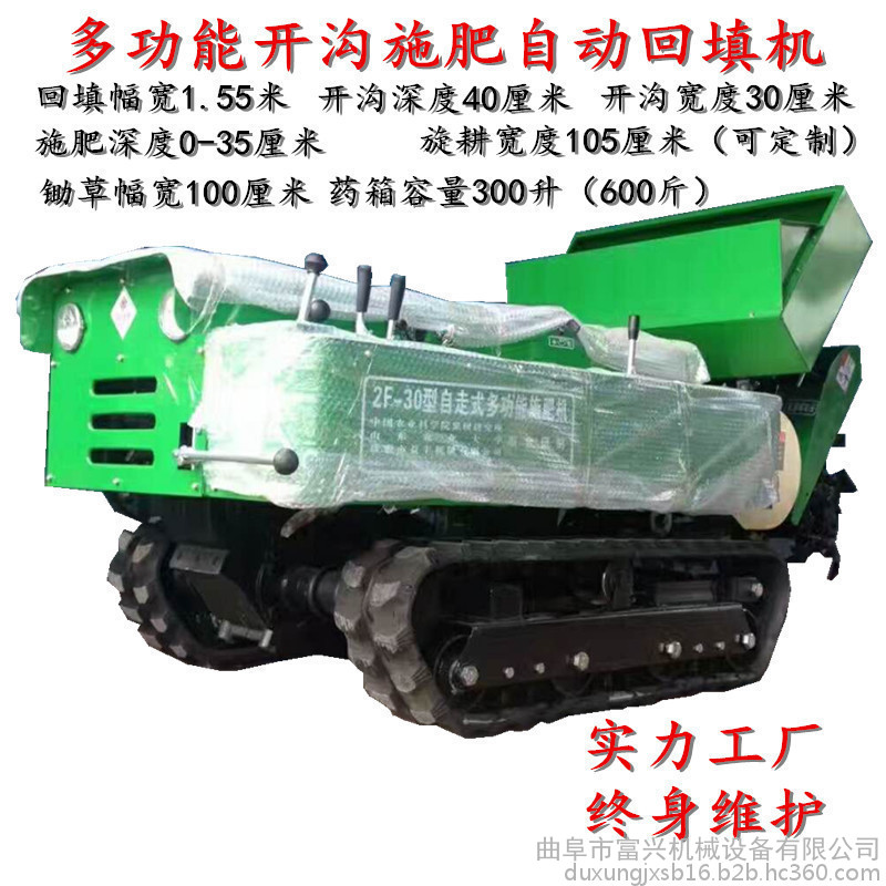 多功能 履带式开沟施肥机安装上不同的配件可以进行单独旋耕、回填、单独开沟、施肥、也可混合搭配使用。产品结实耐用,性能优越,操作方便.耐用:机身加厚,密,履带式行走,可进行原地转向。刀具都是加厚75号猛钢锻造,非常耐磨耐用,工作效率高