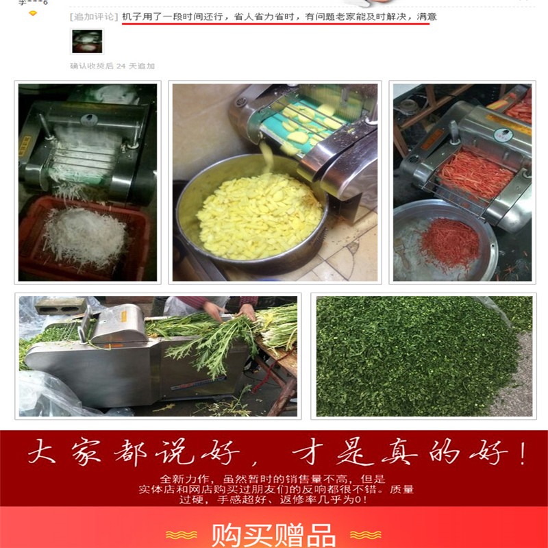 使用操作1、工作前先试切,观察所切蔬菜规格与要求规格是否一致,否则应调节切片厚度或切菜长度,符合要求后进行正常工作。