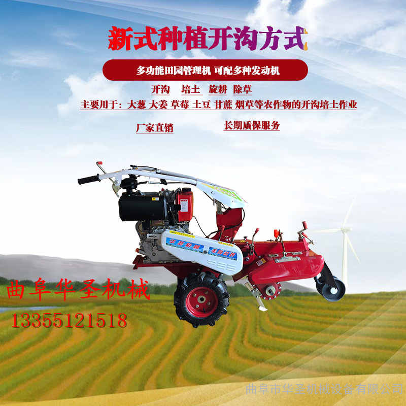 开沟培土机 多功能田园管理机 详细参数功能多,配套齐全,集耕整、田间、园林管理于一体。具有旋耕、犁地、开沟、覆土、起垄、保墒、中耕除草等功能,四驱转向、功率大,开沟深度深;个小劲足,手扶自走轻便易操作,是理想的微型农田管理机械,广泛应用于平原、丘陵、山地等多种作业形式操作方便:人性化设计,操作手把灵活,可上下调整高度,并可360度旋转,适合在任何方向操作,省力。