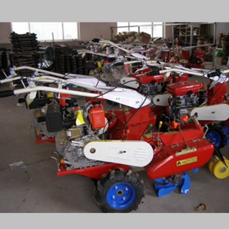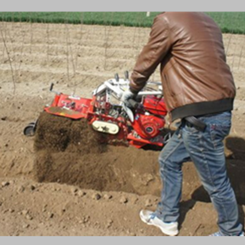 本机器包括机架、可调高低扶手,机架上设有(风冷或水冷)柴油机或汽油机、机架和扶手上设置有变速箱,变速箱的输出轴上设置有能够沿轴移动的驱动轮或链轨.传动方式主要有:全齿轮传动、皮带传动、链条传动三种传动方式.该机具有重量轻,油耗低、相对功率大,结构紧凑、机动性强、操纵轻便灵活的特点。可爬坡、越埂、阶梯性强。广泛适用于平原、山区、丘陵的旱地、水田、果园、菜地、烟地的深旋耕、浅旋耕、犁耕。配上相应机具可进行旱地旋耕、水田旋耕、抽水、开沟、喷淋、喷药除草碎土等作业,还可牵引拖车进行短途运输,是大中型农机无法**的多功能田园管理机,工作稳定可靠、使用寿命长、维修方便等特点。是进入农民家庭**的田园管理机。