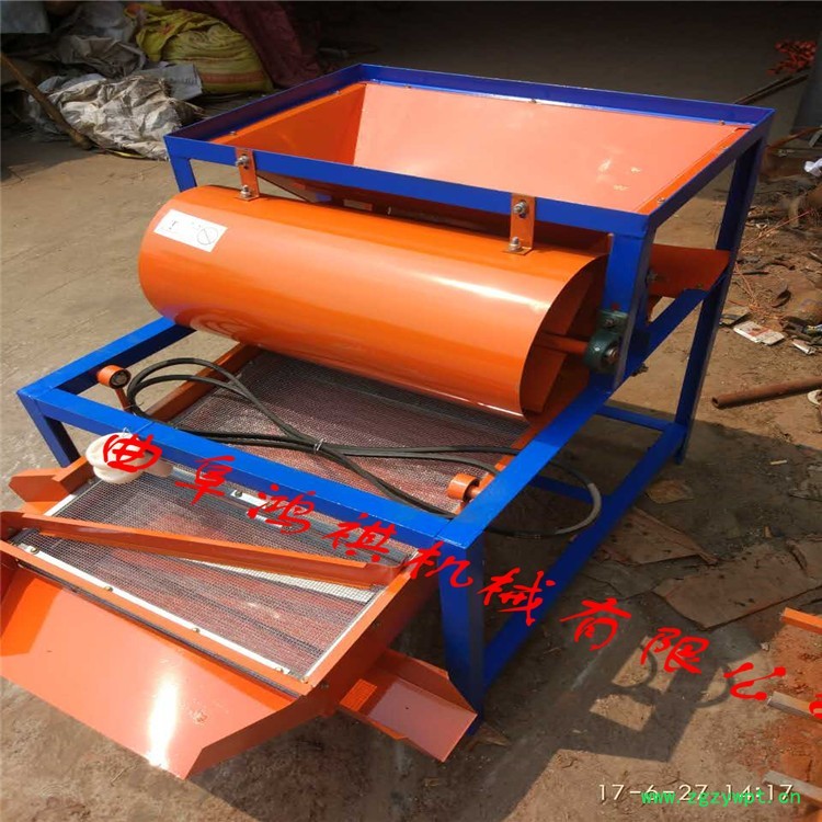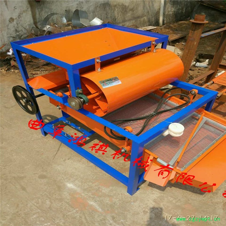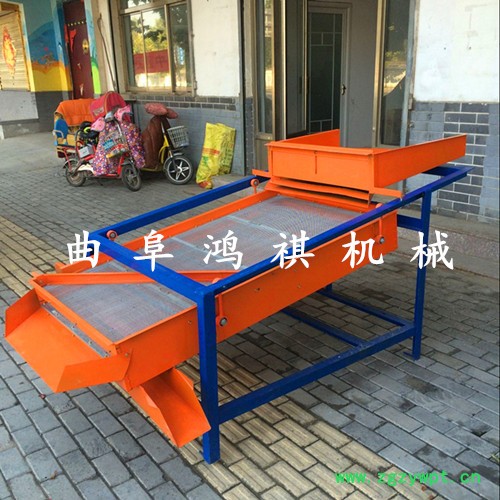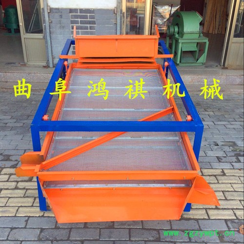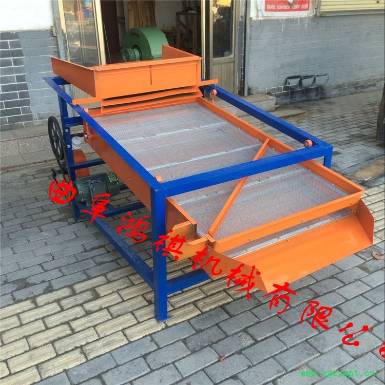 该精选筛为二层筛网,先经过进料口处风机抽风,直接抽走重量轻的杂叶或麦秸秆,上层的初次筛分在把大杂清理过,好的粮食(种子)直接落到下层晒网上,下层筛网会把粮食(种子)中的小杂。小石子,有缺陷的粮食(种子)直接漏掉,完好的粮食(种子)会从出料口筛分开出来。该小型清粮机解决了扬场机的功能单一,不能有效去除石子,土块的缺陷,更能为清理,当净选粮食(种子)带来满意的效果。该机有占地小,移动方便,便以维修,除尘除杂效率明显,能耗低,使用简便等优点。真可谓是中小型粮食清理净选筛中的战斗机!