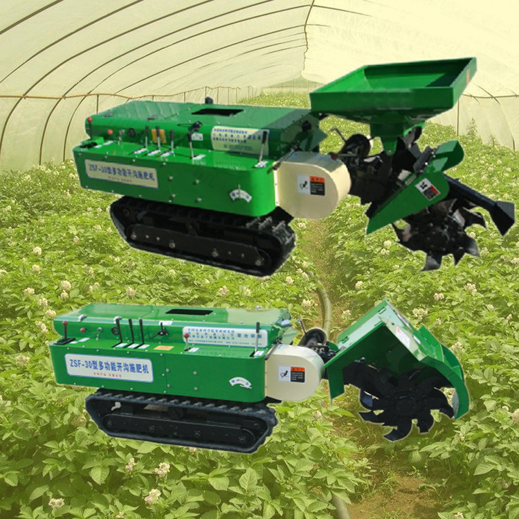 家肥时,开沟机将土抛到沟的两侧,人工将肥料放到沟里后,可通过更换回填机将土回填;使用复合肥