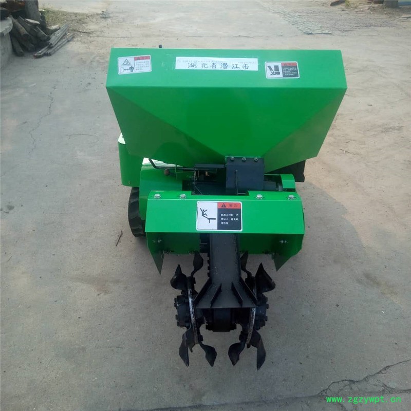 该机动力采用35马力单缸柴油机,发动机为中置,行走变速箱和传动变速箱分开,在丘陵地区开沟施肥作业时不用外加配重,箱内全部为齿轮传动,结实耐用。行走采用橡胶履带,行走直线性和通过性好,与地面接触面积大,不易打滑。开沟刀采用65锰钢自制,刀刃全部用耐磨焊条加强焊制,比普通开沟刀结实耐用至少10倍;采用蛟龙式强制排肥,下肥量可调,每米0.5~15斤,并且干的小块牛羊粪可通过施肥自动回填装置直接施肥,大块农家肥可通过单独开沟进行施肥;本机主要有六大功能:开沟施肥自动回填一次性完成(化肥)、单独开沟施土杂肥、单独除草、更换回填和旋耕装置后可进行回填和旋耕作业,更换风扇可以进行喷雾式打药功能(客户自选);该机体积小,重心低,操作灵便,可原地转向,适用于果园葡萄、果树、枸杞、蓝莓等经济作物的开沟施肥作业。