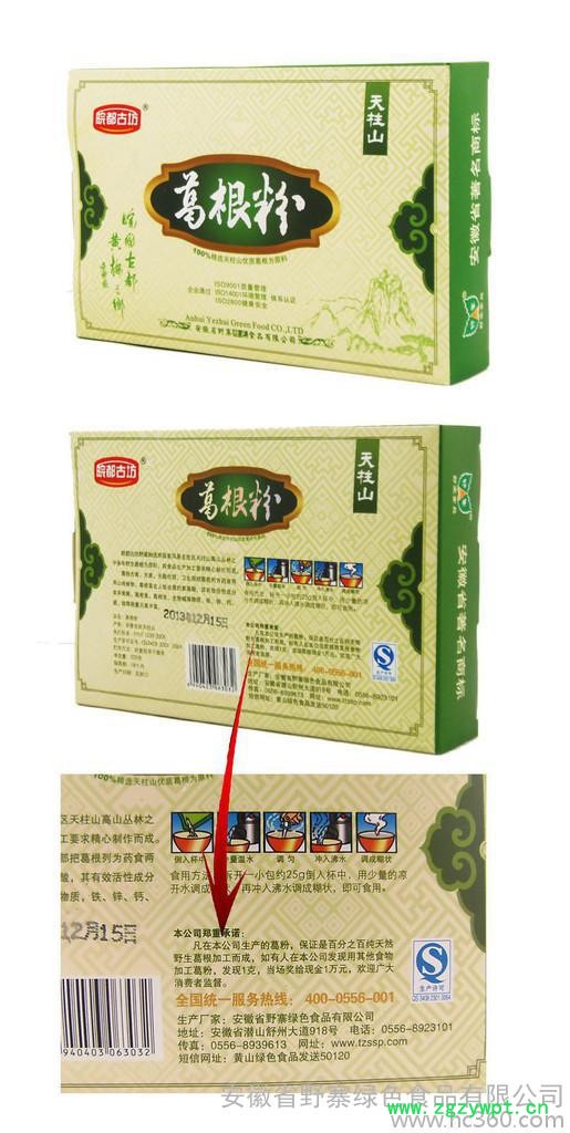 其次,我们的葛粉的纯度可以达到****:1、我们的葛粉保留加工时的原貌,颗粒状,现在市场上可以看到不少的粉末状的,据了解不少都掺杂了其他的淀粉,使得其纯度不够;2、我们的产品包装上印有发现一克假的,奖励一万元的承诺,市场上能做到如此承诺的仅此我们野寨一家。