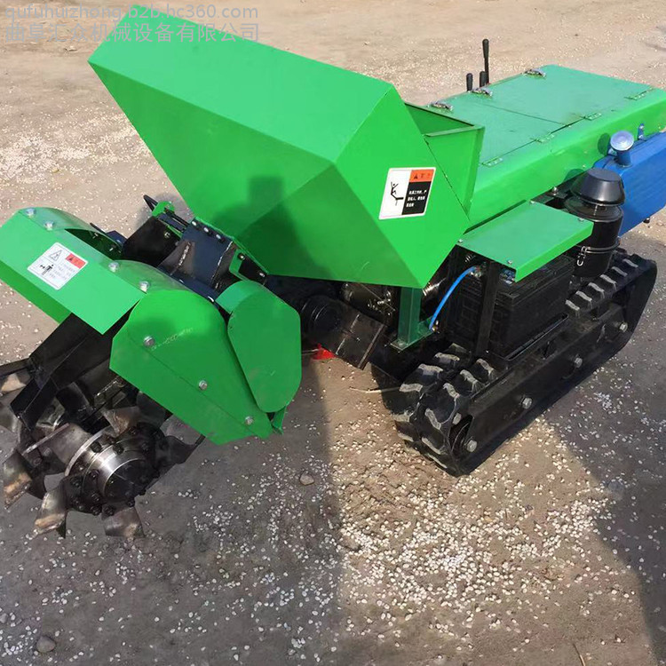 履带式果园开沟机视频 全自动果园施肥机 自走式果园开沟施肥机生态果园开沟施肥机 机械化管理开沟机果树开沟施肥机价格果树开沟施肥机厂家葡萄开沟施肥机 开沟机厂家本机主要由变速箱、机架、履带、传动箱、发动机、开沟机、施肥箱、排肥器等组成,其结构见图1。该机工作原理是:发动机输出两路动力,通过三角带一路传给变速箱,通过齿轮传动驱动机器行走。一路传给传动箱,通过齿轮传动驱动开沟机工作。使用农家肥时,开沟机将土抛到沟的两侧,人工将肥料放到沟里后,可通过更换回填机将土回填;使用复合肥时通过更换刀具和护罩,施肥后直接将土回填,一次性完成施肥作业。通过更换箱体本机还可完成旋耕、除草、回填等作业。提高了机器的利用率。
