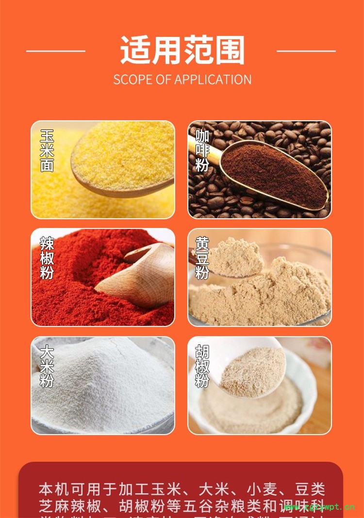 该机具有结构简单,安装使用维修方便,使用范围广等特点。适用于粮食粉碎,农作物粉碎,中草药材粉碎,薯类粉碎,调料粉碎,饲料粉碎。它是一种小型﹑多用﹑新式粉碎机,不但能粉碎玉米﹑高梁﹑大米﹑小麦﹑大豆等各种粮食,也能粉碎水渍大豆﹑干鲜薯类﹑花椒﹑中草药等;适合广大城乡单位和家庭粮食加工﹑饲料加工和其它专业加工使用。