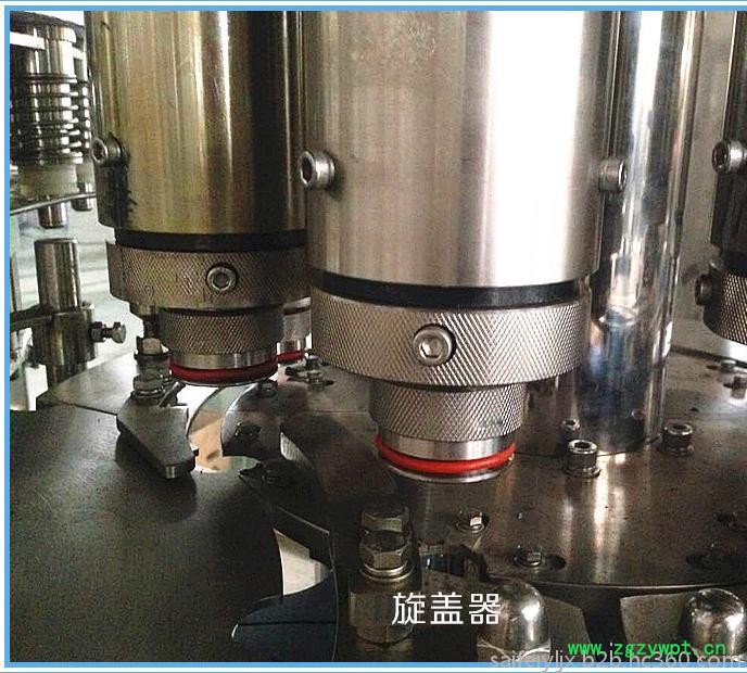 本系列设备用于聚脂瓶装各种纯净水、矿泉水的生产。在一机上实现冲瓶、灌装、封盖。整机设计科学合理,外形美观,功能齐全,操作维修方便,自动化程度高。综合采用意大利、德国先进技术。灌装速度快,液面控制稳。采用风送进瓶、夹瓶口、冲洗、卡瓶口灌装、封盖、不受瓶子高矮限制,只要瓶口、瓶盖相同随意更换瓶形,更换一下拔轮板即可。油尼龙齿轮传动,噪声小,整机运转平稳。采用磁力扭矩式拧盖头,实现抓盖、拧盖功能。拧盖力矩无级可调,具有恒力矩旋封塑盖功能,且不伤盖,封口严密可靠。水平回转式气力理盖器,具有不损坏瓶盖表面,料斗内缺盖发信号自动补充盖等功能。整机采用PLC电脑程序控制及人机界面触摸屏按钮,具有料缸内液面自动控制,无瓶不灌装,无瓶不加盖功能,并有拨瓶星轮卡瓶错位停机,盖滑槽内缺盖停机等功能。