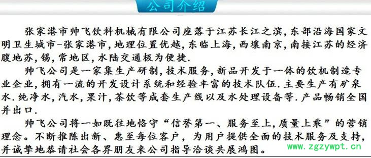 张家港市帅飞饮料机械有限公司,三兴海沙社区 (如来厂联系业务,随时有厂车接送),主要经营三合一灌装机;瓶装水生产线;大桶灌装机;灌装生产线;桶装水灌装机;饮料灌装..果汁纯净水生产线,桶装水生产线,主打产品纯净水生产线, 净水处理,饮料灌装生产线以可靠的性能,详情请点 //saifeiyljx.b2b.hc360.com 完善的服务畅销15716243185