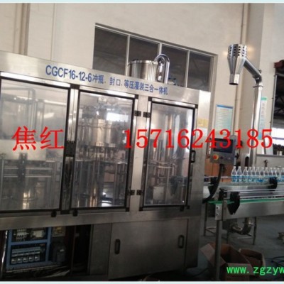 我厂生产的含气饮料三合一灌装线适合聚脂瓶装各种碳酸饮料的自动化生产。冲瓶、灌装、封盖自动完成。整机性能先进、实用美观,功能齐全,操作维修方便,自动化程度高,灌装速度快,液面控制稳定。如:无瓶时不灌装,冲气或灌装时爆瓶则灌装阀将自动关闭,并有自动冲洗等先进自控技术。采用托瓶提升气 缸,油尼龙齿轮传动,噪声小,整机运转平稳。采用磁力扭矩式拧盖头,实现抓盖、拧盖功能。拧盖力矩无级可调,具有恒力矩旋封塑盖功能,且不伤盖,封口严密可靠。水平回转式气力理盖器,具有不损坏瓶盖表面,料斗内缺盖发信号自动补充盖等功能。整机采用PLC电脑程序控制及人机界面触摸屏按钮,具有料缸内液面自动控制,无瓶不灌装,无瓶不加盖功能,并有拨瓶星轮卡瓶错位停机,盖滑槽内缺盖停机等功能。可根据用户的不同要求定做各类生产线。