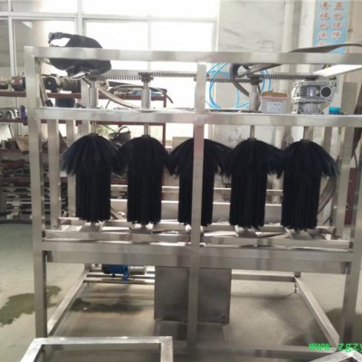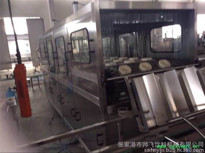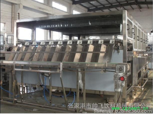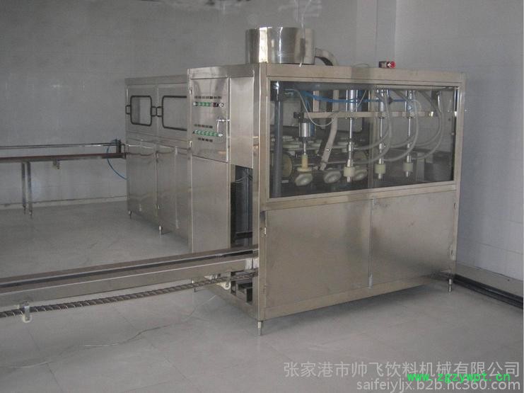 本设备由冲洗,滴干,灌装和压盖一体主机组合成,适用于3-5加仑桶装饮用水的灌装生产。冲洗过程分三道工序;碱性液态除污剂内,外冲洗→消毒水内,外冲洗→纯净水内,外冲洗。碱性水,消毒水可循环使用。整个冲洗灌装封盖过程采用了PLC电脑控制,本设备有连锁,信号,自测等安全装置。