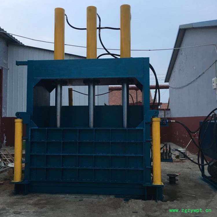 立式液压打包机主要由液压缸、电机与油箱、压盘、箱体及底座、上门、下门、门闩、打包带支架、铁支等构成。