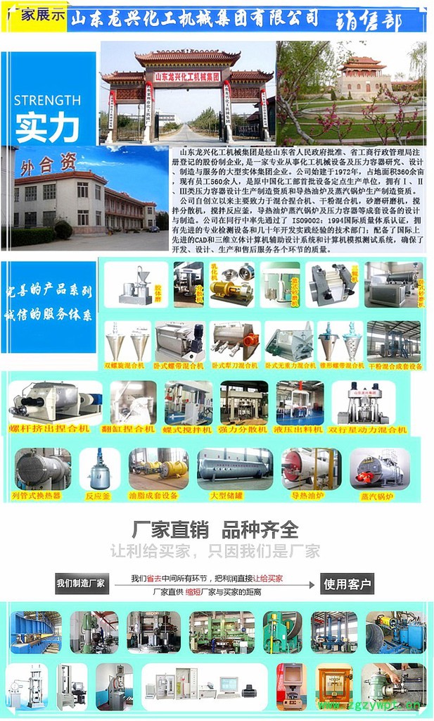 我公司凭借在业内三十余年的技术积累和成长经历,已经发展为集科研、开发、制造为一体的科技型集团公司,主要业务涉及液体研磨机、搅拌分散机,膏体混拌捏合机、双行星动力搅拌混合机,干粉搅拌混合机,导热油、蒸汽锅炉、反应釜和换热器及一二三类压力容器的设计与生产。同时我们承接行业用户成套设备及生产线的设计制造业务,龙兴人愿与天下有识之士携手共创新的辉煌。