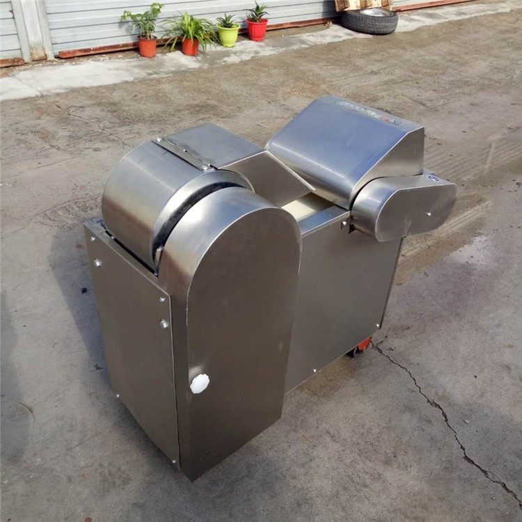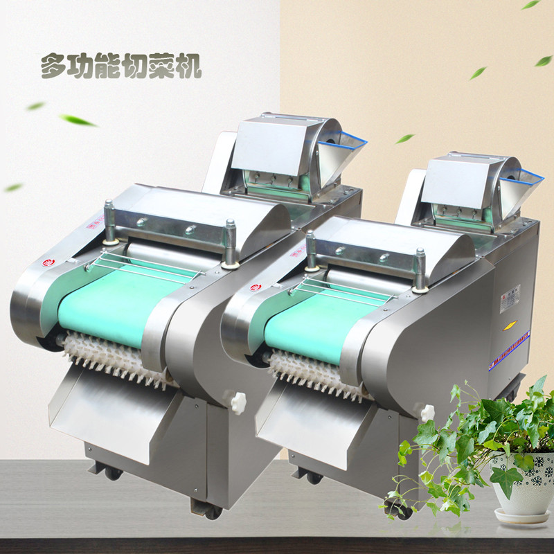 多功能型切菜机包含单切机的所有功能的同时,也可切圆形如土豆、萝卜等。 可将根、茎、叶等蔬菜加工成片、丝、丁、菱、曲线、花丁、花片等。切片装置用于硬菜(萝卜、土豆、水果、薯类)的切片,厚度可自由调整;往复竖刀将刀成的菜片或软菜(韭菜、芹菜)切成直丝或段、曲线丝、方丁(或形刀)输送带可自由调整。所调整量即为丝段的宽度;应注意被切菜直径较粗时(大于30毫米)出片效果才好,便于切丁,直径小时制的片或丁将会杂乱。被切菜加工面平整光滑、规则,组织完好,保持手工切制的效果。