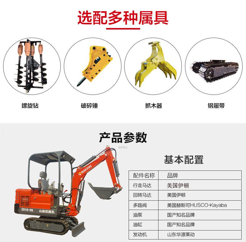 SD18-9B(进口型)山鼎小型挖掘机 六大卖点:一.核心液压系统原装进口,美国派克阀,韩国原装**油压回转系统、日本岛津泵等。二.自动伸缩式底盘及变形推土铲;三.独特的电磁控制系统,自动控制偏转功能;四.新式覆盖件,便于更好的散热和维修;五.方管式小臂一次成型,结实耐用;六.半无尾回转,能在狭小空间活动自如。