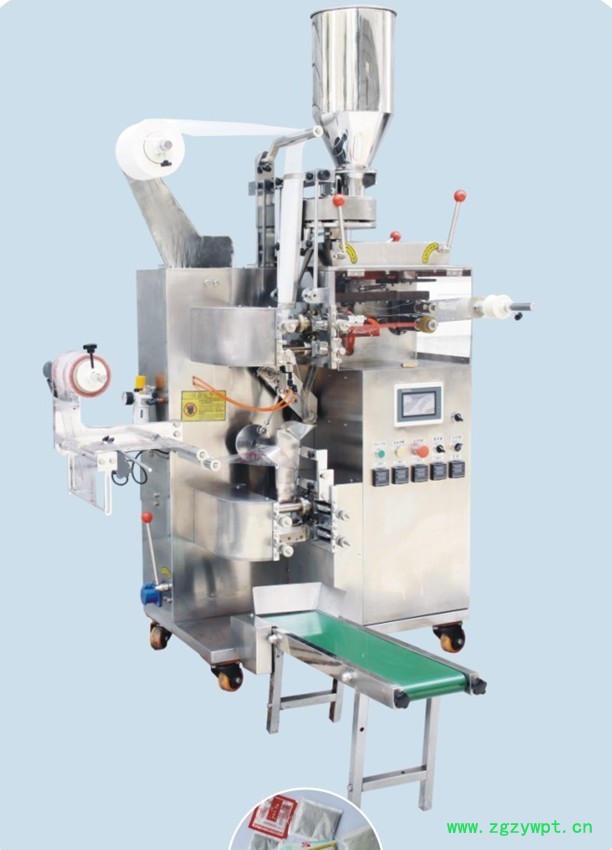 本机是一种新型热封式,多功能全自动袋泡茶饮品包装设备。该机的主要特点是内外袋一次成型,避免了人手与物料的直接接触,提高效率。内袋为过滤棉纸,可自动带线带标签,外袋为复合纸。其好处在于:贴标和外袋均可采用光电定位,包装容量、内袋、外袋、标签等均可任意调整,可根据用户的不同需要来调整内外袋尺寸,以便达到理想的包装效果,提高产品外观档次,使产品价值提升。