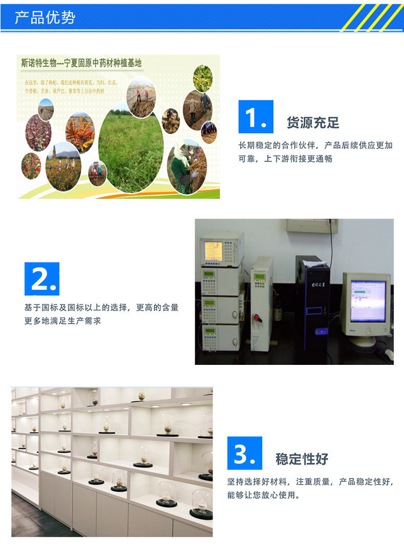 我厂生产提取物原料,采用高质量原材料进行生产。每个生产流程都严格把控,再确保每样产品都是合格后,方可出厂销售!客户的满意**是我们一贯的追求!