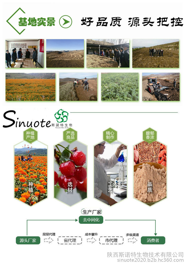我厂生产提取物原料,采用高质量原材料进行生产。每个生产流程都严格把控,再确保每样产品都是合格后,方可出厂销售!客户的满意**是我们一贯的追求!