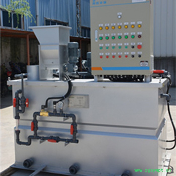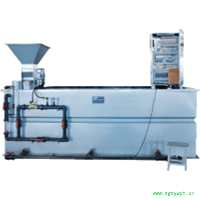 TCZB系列三厢式加药装置由控制箱自动控制,此控制箱与安装在溶液储存槽上的液位计相连,一旦液位计达到“低位”,触发进水电磁阀打开,同时启动干投机,开始配药,浓度可以调整。一旦液位计达到“高位”,此循环过程**停止,搅拌机继续工作。