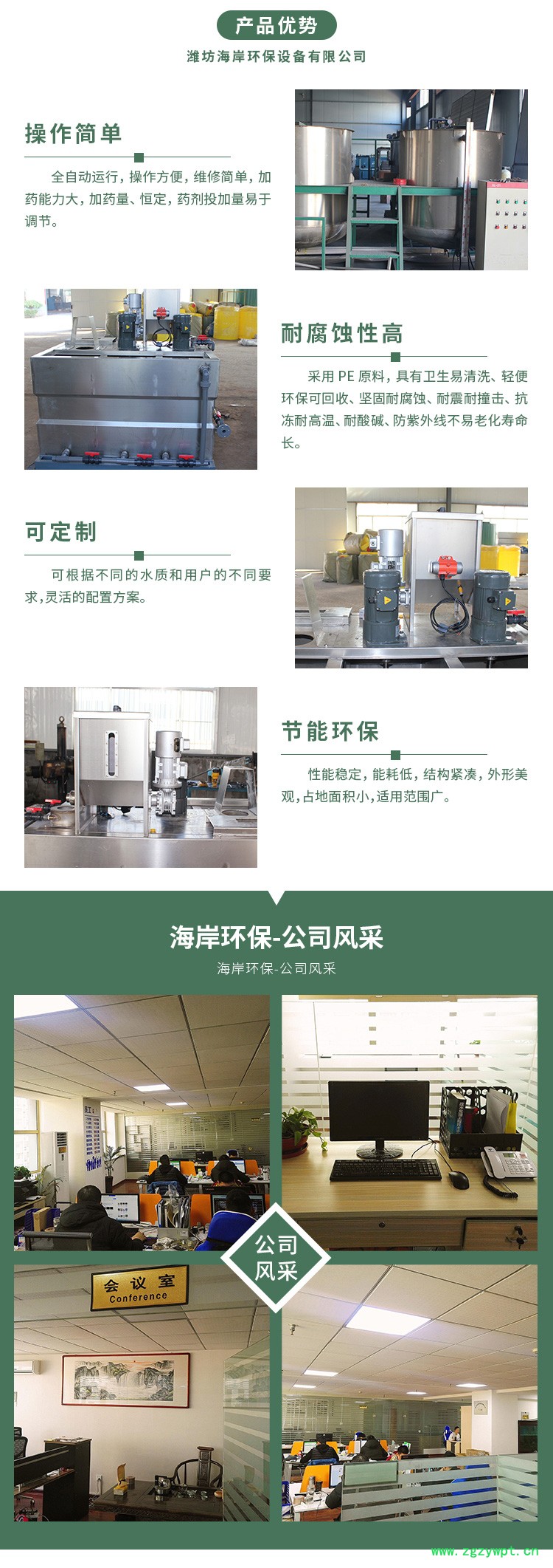 2、自动化程度高,加药均匀准确。通过微电脑加药控制器(计量泵)控制加药量,除了定期向溶药桶内投加药剂外,无须任何人工操作,节约了大量人力,加药量更准确;