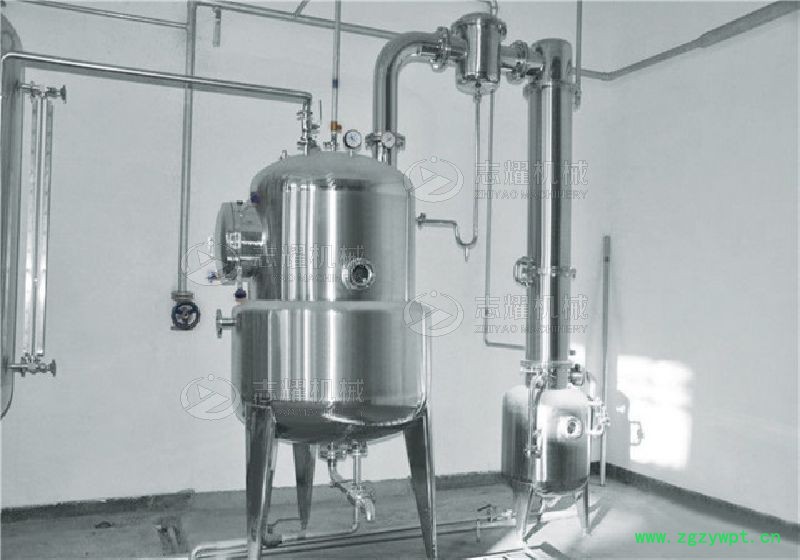 1.设备主要由浓缩罐、气液分离器、冷凝器、受液罐等部分组成。浓缩罐为夹套结构,冷凝器为列管式。