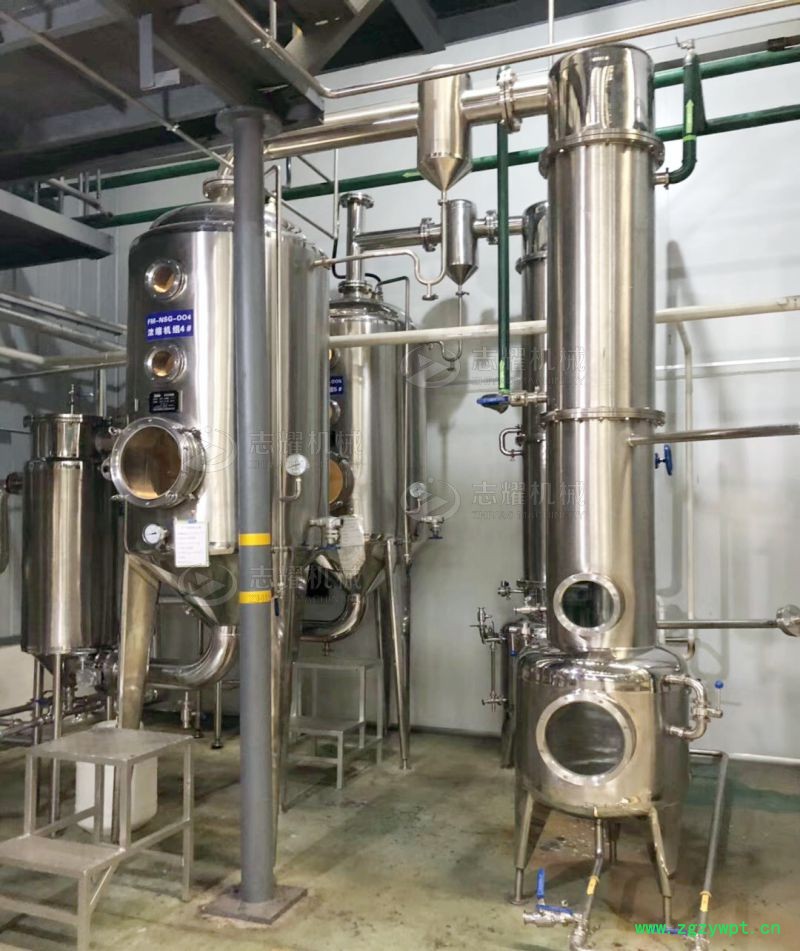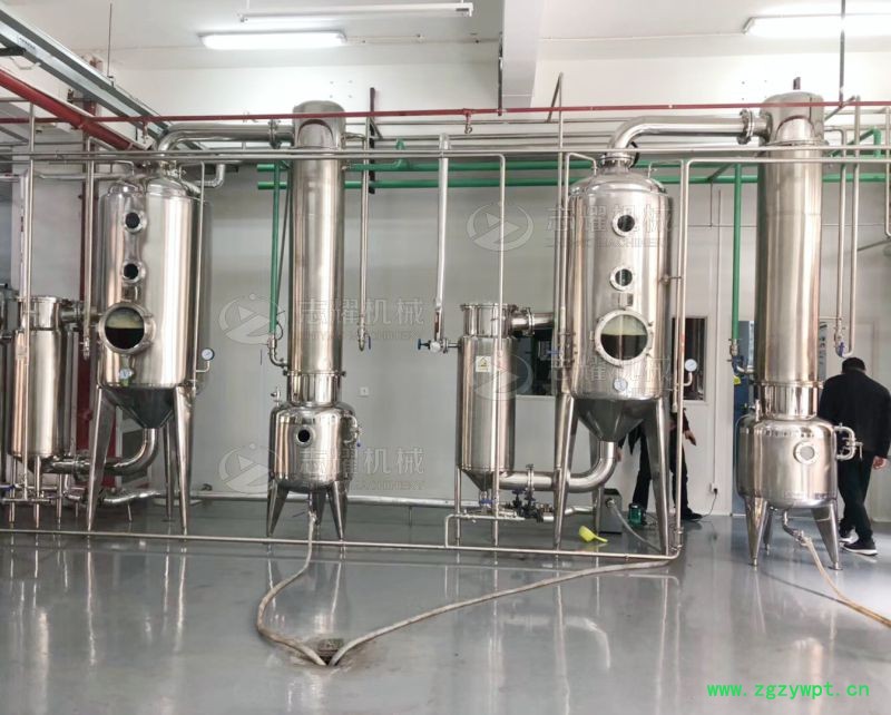 2、浓缩液料: 单效浓缩器采用外加热自然循环与真空负压蒸发相结合的方式,蒸发速度快,浓缩比可达1.3,液料在全密封状态无泡沫浓缩,用单效浓缩器浓缩出来的药液,具有无污染,药味浓的特点,而且清洗方便(打开加热器的上下盖即可进行清洗)。单效浓缩器操作简单,占地面积小。加热器、蒸发器采用不锈钢保温结构,保温层外用不锈钢薄板制作外壳,表面做镜面或亚光处理。