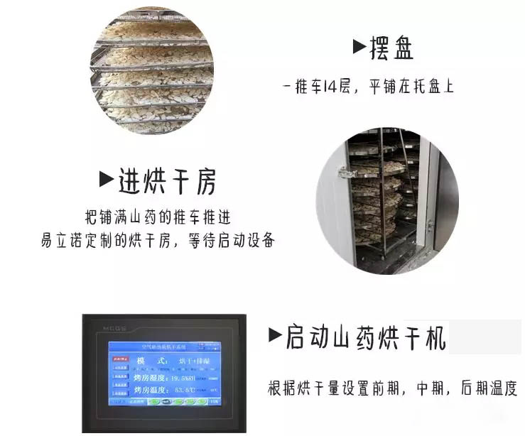 1、开始阶段,升温阶段:将切好片山药平铺在烘烤架子上,推进烤房。启动易立诺热泵烘干机,开始向箱内送热风,逐渐将箱内温度加热至50°,加热30分钟~1.5小时,湿度升高,开始除湿,采用易立诺热泵烘干除湿一体机,除潮的时候可以保持恒温状态。