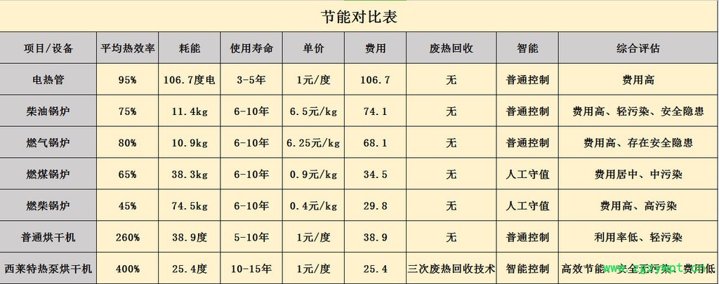 广州西莱特热泵烘干机三道废热回收技术使其比传统的电热管、燃油、锅炉、燃气锅炉、燃煤锅炉、燃柴锅炉的平均热效率、能耗单价费用都会更低。使用时无污染排放更环保采用电气分离更安全、智能触摸屏电脑控制更智能。