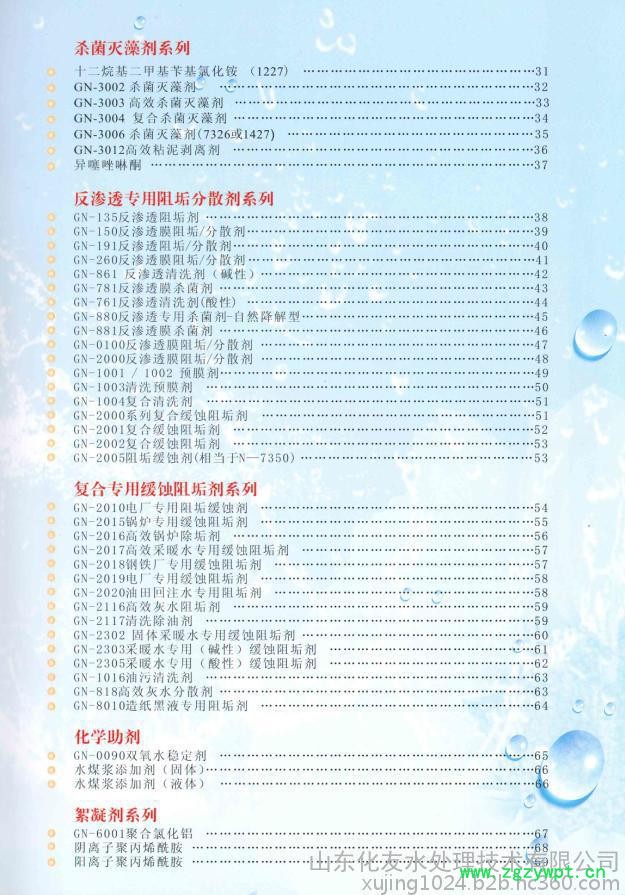 一、性能与用途 GN-1016油污清洗剂是配合润湿、渗透、分散、流体力学的基础上,经高温聚合而成。具有很强的乳化分散性和防锈蚀性能,对人体安全、无毒。防锈性:符合JB4332-标准 项 目 指 标 外 观 无色至琥珀色液体 有效成分含量 % ≥ 85.0 密度(20℃)g/cm3 ≥ 1.0±0.05 pH(1% 水溶液)≥ 7.0 三、使用方法 五、安全与防护 我公司还可生产和提供以下水处理药剂: