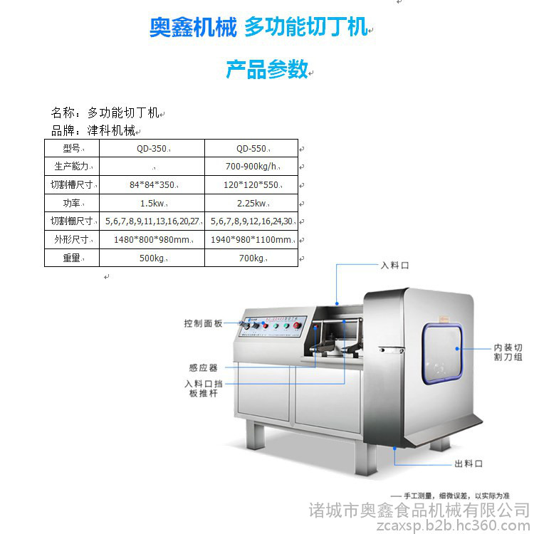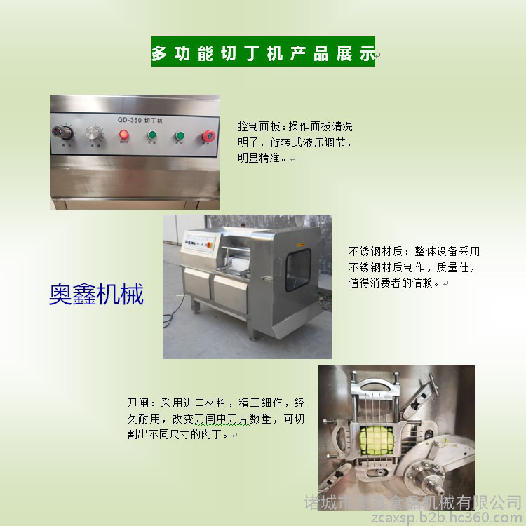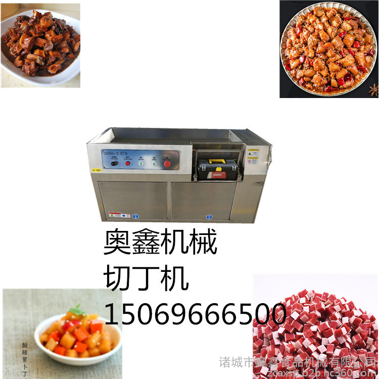 奥鑫机械切丁机适用于脱水蔬菜、速冻蔬菜加工厂及食品酱菜行业加工各种根、茎类蔬菜成正方体及长方体形状。该机采用复合刀具,一次成型,形状规则,切面光滑,成型率高,深受外贸出口单位青睐。本机设计先进,操作方便,耗能低,效率高,采用铝镁合金及不锈钢材料,防腐,美观,符合卫生标准。