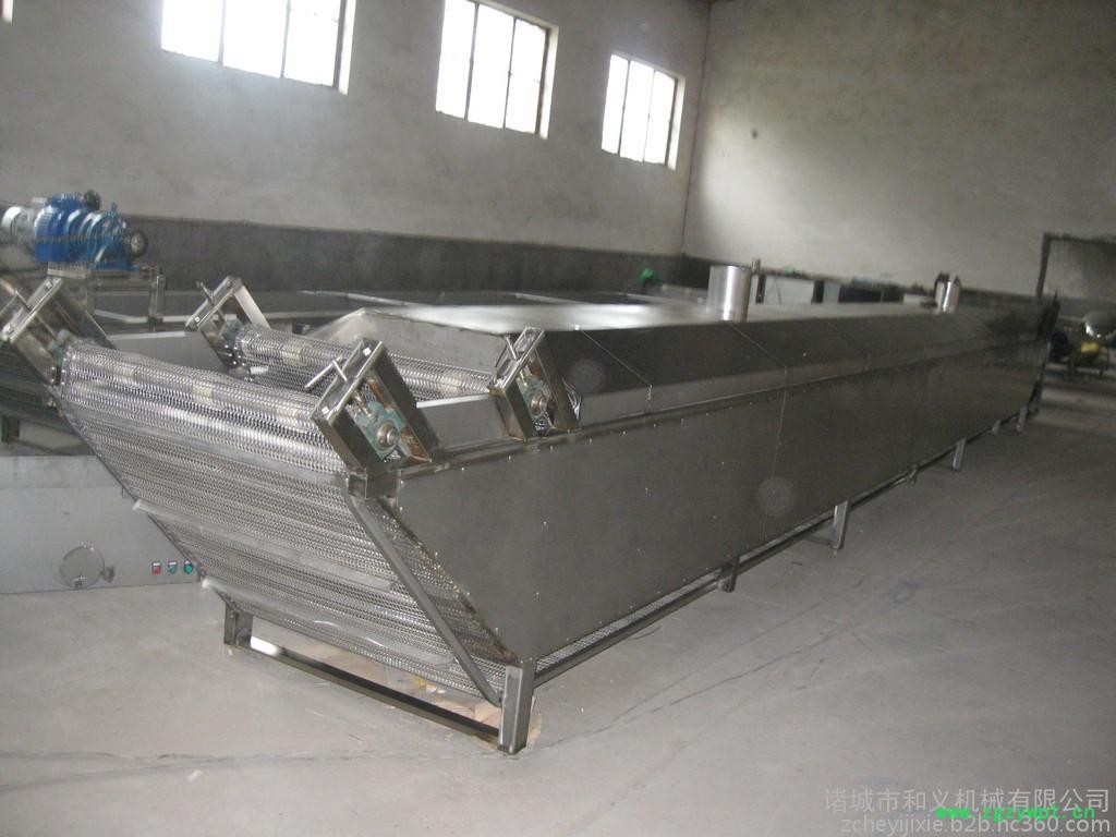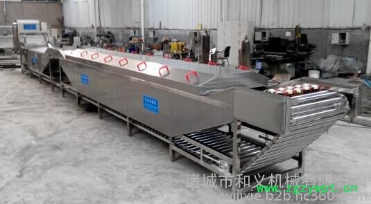 该杀菌流水线分杀菌和冷却两部分,通过链条的不断运转,带动被杀菌物进入槽内连续作业,适用于酱菜、腌渍菜、低温肉制品、果汁、果冻、酸奶及各类饮料的自动化连续巴氏杀菌,也可用于蔬菜的漂烫、杀青处理。