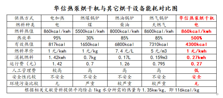 6.运行费用低:由于设备初投资小,运行费用低,热泵烘干机装置具有明显的经济性。热泵干燥装置的设备成本主要是热泵部分和干燥室部分,其中干燥室部分与普通对流干燥室要求相同,无特别的气密性和承压性要求。热泵烘干机干燥装置的能源效率高,运行费用低,其综合经济性仍有一定优势。