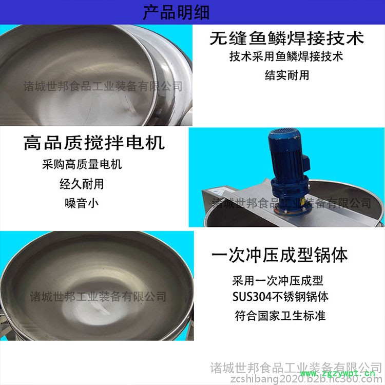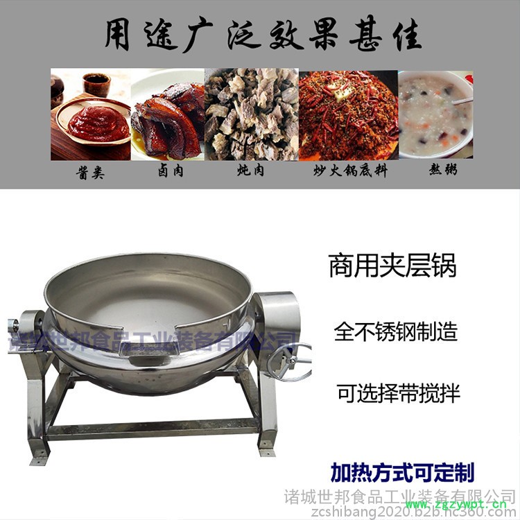 可倾式夹层锅夹层锅又名蒸汽锅、蒸煮锅、夹层蒸汽锅。夹层锅广泛应用于糖果、制药、乳品、酒类、糕点、蜜饯、饮料、罐头、卤味等食品的加工,也可用于大型餐厅或食堂熬汤、烧菜、炖肉、熬粥等,是食品加工提高质量、缩短时间、改善劳动条件的良好设备。