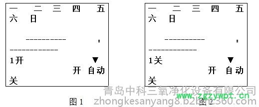 ??按一下“定时”键,液晶显示屏出现下图2所示,且显示定时“关”,再按“校时”键、“校分”键,来设定①次关闭的时间。