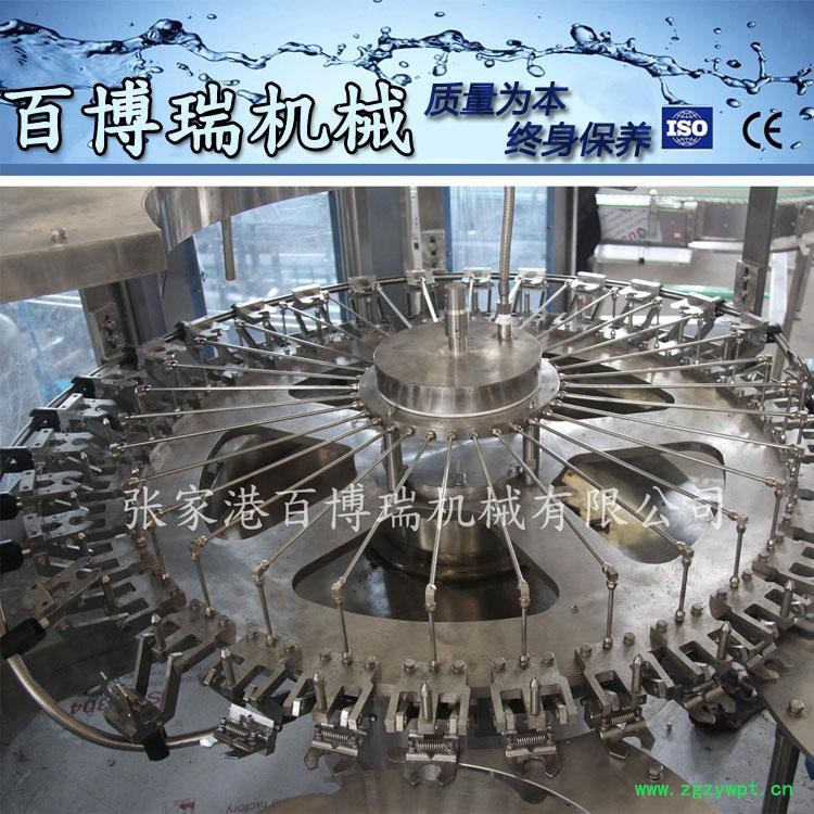 生产过程如下:瓶子通过风道传送至三合一灌装机。冲瓶机的回转盘上装有瓶夹,瓶夹夹住瓶口沿一导轨翻转180°,使瓶口向下进入冲瓶机。在冲瓶机的特定区域,特制喷嘴喷出冲瓶水,对瓶子内壁进行冲洗。瓶子经冲洗、沥干后在瓶夹夹持下沿导轨再翻转180°,使瓶口向上。洗净后的瓶子通过拨瓶星轮由冲瓶机导出并传送至灌装机。进入灌装机的瓶子由瓶颈托板卡住瓶口保持,通过升降机机构在凸轮作用下实现下降下与上升。灌装采用重力灌装方式,瓶口上升顶开灌装阀完成灌装过程。灌装结束后瓶口下降离开灌装阀。瓶子通过卡瓶颈过渡拨轮进入旋盖机。旋盖机上的止旋刀卡住瓶颈部位,保持瓶子直立瓶防止旋转。旋盖头在旋盖机上保持公转并自转,在凸轮作用下实现抓盖、套盖、旋盖、脱盖动作,完成整个封盖的过程。成品瓶通过出瓶拨轮从旋盖机传送到出瓶输送链上,由输送链传送出三合一瓶装机。整机设备采用封闭,封窗高度高于设备**高点,进、出瓶处留有适当的通道,封窗底部留有排风槽。