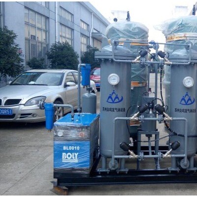 PSA变压吸附制氮原理碳分子筛可以同时吸附空气中的氧和氮,其吸附量也随着压力的升高而升高,而且在同一压力下氧和氮的平衡吸附量无明显的差异。因而,仅凭压力的变化很难完成氧和氮的有效分离。如果进一步考虑吸附速度的话**能将氧和氮的吸附特性有效地区分开来。氧分子直径比氮分子小,因而扩散速度比氮快数百倍,故碳分子筛吸附氧的速度也很快,吸附约1分钟**达到90%以上;而此时氮的吸附量仅有5%左右,所以此时吸附的大体上都是氧气,而剩下的大体上都是氮气。这样,如果将吸附时间控制在1分钟以内的话**可以将氧和氮初步分离开来,也**是说,吸附和解吸是靠压力差来实现的,压力升高时吸附,压力下降时解吸。而区分氧和氮是靠两者被吸附的速度差,通过控制吸附时间来实现的,将时间控制的很短,氧已充分吸附,而氮还未来得及吸附**停止了吸附过程。因而变压吸附制氮要有压力的变化,也要将时间控制在1分钟以内。