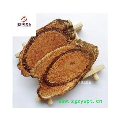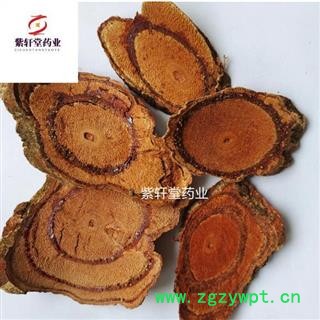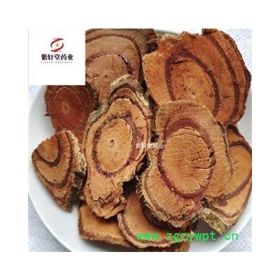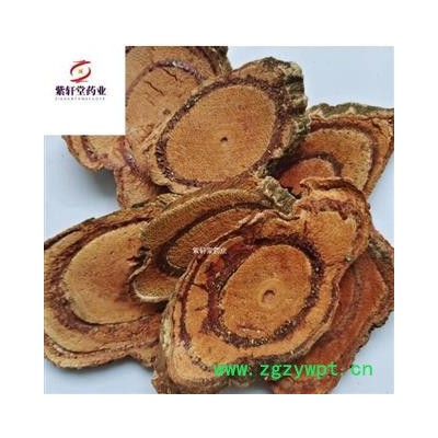 [性 状]:血藤片为椭圆形、长矩圆形或不规则的斜切片,厚3~10mm。切面木部红棕色或棕色,导管孔多数,不规则排列,皮部有树脂状分泌物,呈红棕色至黑棕色,并与木部相间排列成3~10个偏心性半圆形或圆形环。髓小,偏于一侧。气微,昧涩。以树脂状分泌物多者为佳。