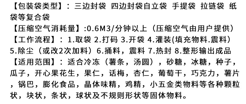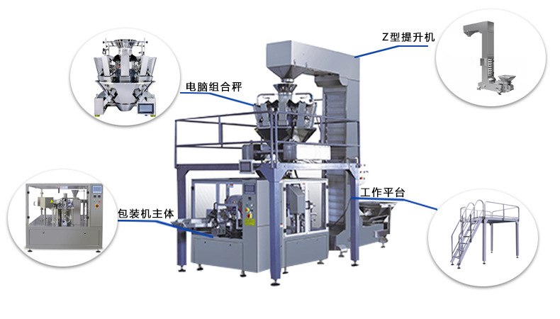 配套设备:组合称 Z型提升机 工作平台 给袋式包装机