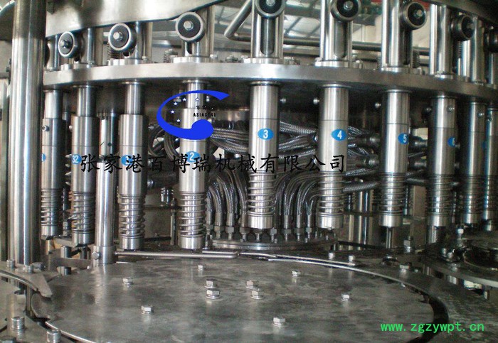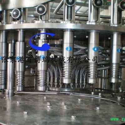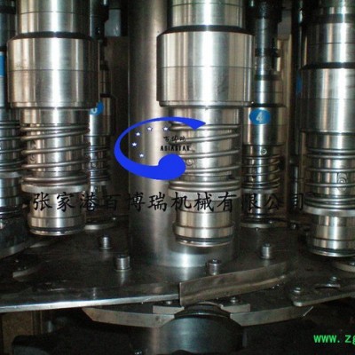 本系列设备用于颗粒果汁等不含气饮料的生产.在一机上实现冲瓶,灌装,封盖.引进日本、意大利**技术,采用压力式定液面灌装原理,灌装速度快,液面控制稳,无滴漏现象。弹簧式冲洗钳手,空瓶随轨道自动进行180°翻转,内外二道冲洗,冲瓶效率高。采用磁力扭矩式拧盖头,实现抓盖、拧盖力矩无极可调,具有恒力矩旋封塑盖功能,且不伤盖,封口严密可靠。整机采用PLC电脑程序控制及人机界面触摸屏按钮,具有料缸内液面自动控制,无瓶不灌装,无瓶不加盖等功能,采用变频器无级调速,生产能力数字显示,调整极其方便。
