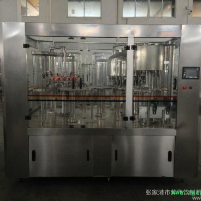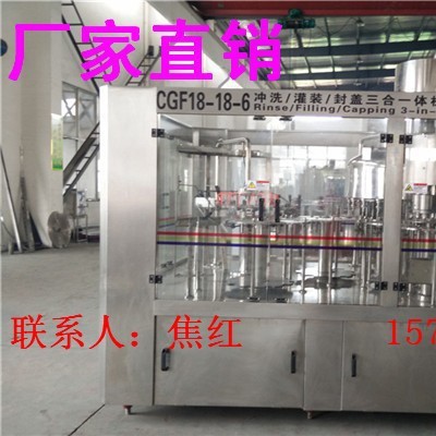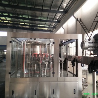 本系列设备用于聚脂瓶装各种纯净水、矿泉水的生产。在一机上实现冲瓶、灌装、封盖。整机设计科学合理,外形美观,功能齐全,操作维修方便,自动化程度高。综合采用意大利、德国先进技术。灌装速度快,液面控制稳。采用风送进瓶、夹瓶口、冲洗、卡瓶口灌装、封盖、不受瓶子高矮限制,只要瓶口、瓶盖相同随意更换瓶形,更换一下拔轮板即可。油尼龙齿轮传动,噪声小,整机运转平稳。采用磁力扭矩式拧盖头,实现抓盖、拧盖功能。拧盖力矩无级可调,具有恒力矩旋封塑盖功能,且不伤盖,封口严密可靠。水平回转式气力理盖器,具有不损坏瓶盖表面,料斗内缺盖发信号自动补充盖等功能。整机采用PLC电脑程序控制及人机界面触摸屏按钮,具有料缸内液面自动控制,无瓶不灌装,无瓶不加盖功能,并有拨瓶星轮卡瓶错位停机,盖滑槽内缺盖停机等功能。